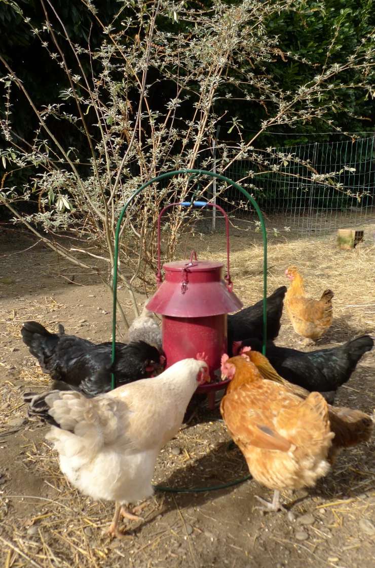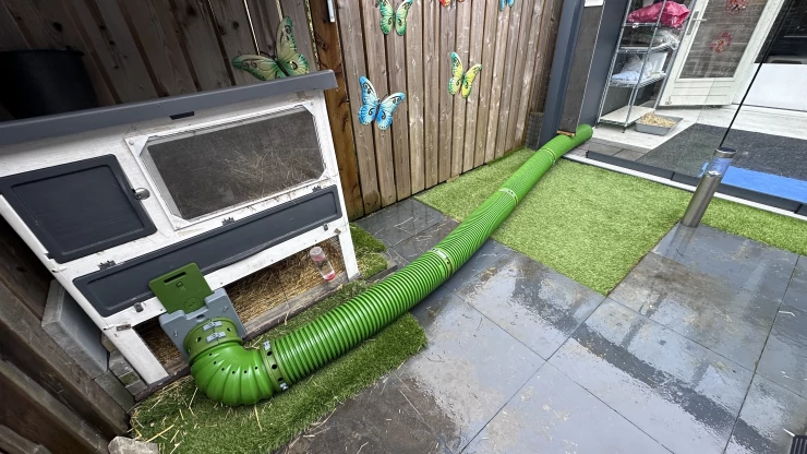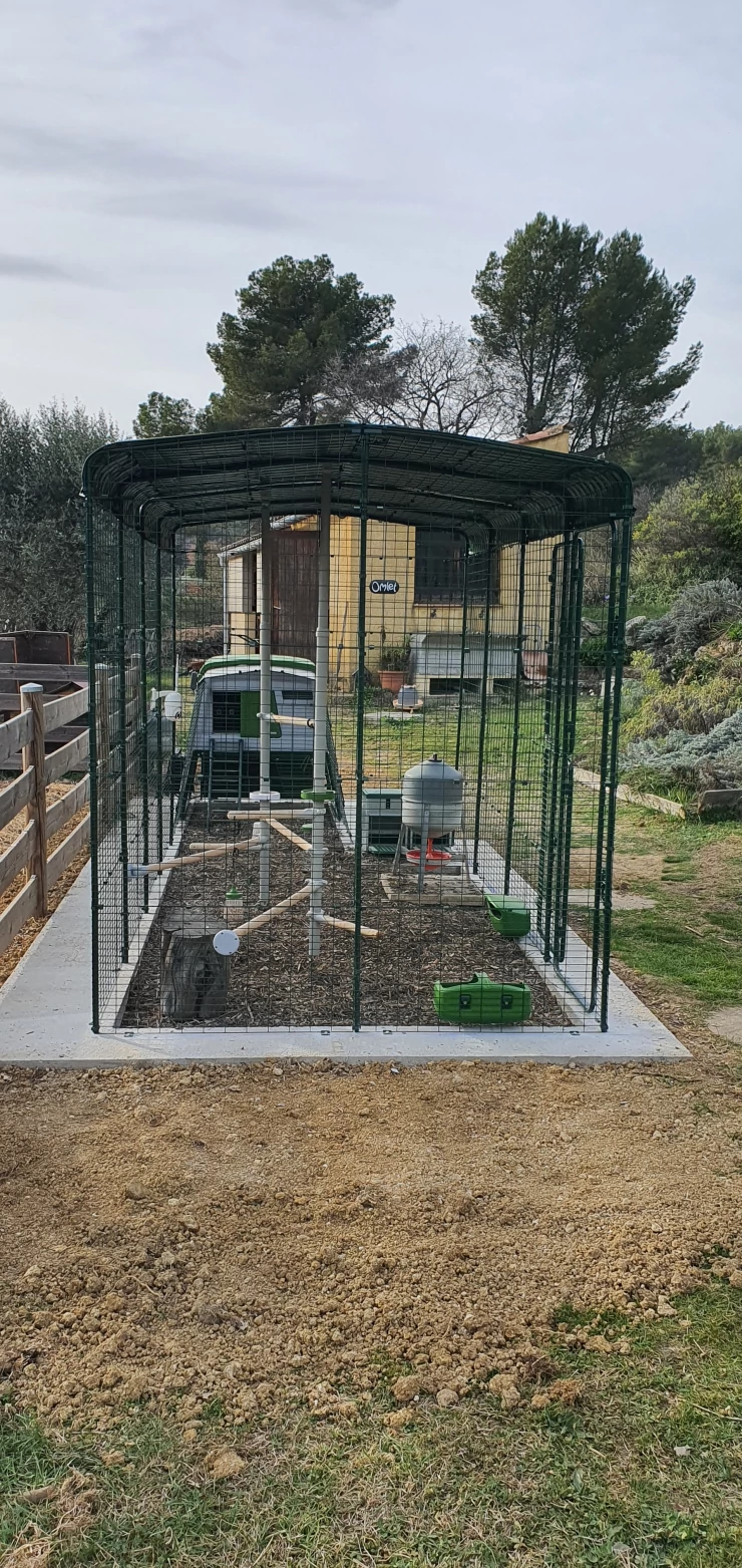 Titel: Hönshus installerat på en betongkant för enkel gräsklippning utan att skada trådnätet