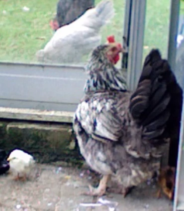 Titel: Maskin....silver sussex (2008-nu) inte en av mina bästa hönor, jag misstänker att hon är en hybrid sussex snarare än en renrasig. hon är en riktig fjäderplockare och mellan henne och mina amberlinks äter de upp allt!