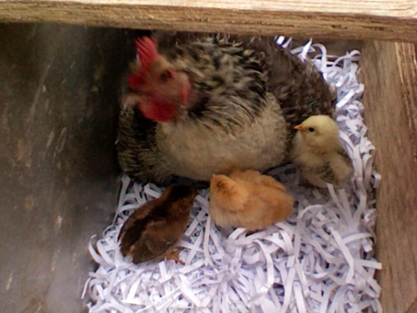 Titel: Loopy slår sig till ro för natten med sina 5 adopterade veckolånga kycklingar.
