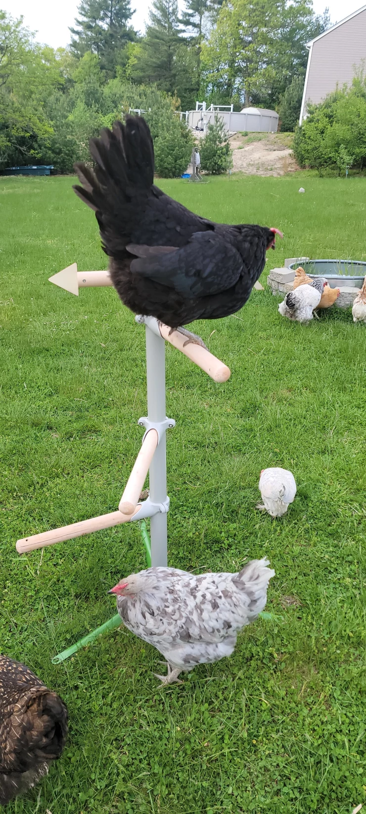 Titel: Höns perching tree är fantastisk. lätt att montera, stora stabila fästen till marken som tillhandahålls. behandla skålen är rörlig och säker som ger underhållning för flocken. väderkana rör sig runt och kan lekas med av hönsen. denna perch