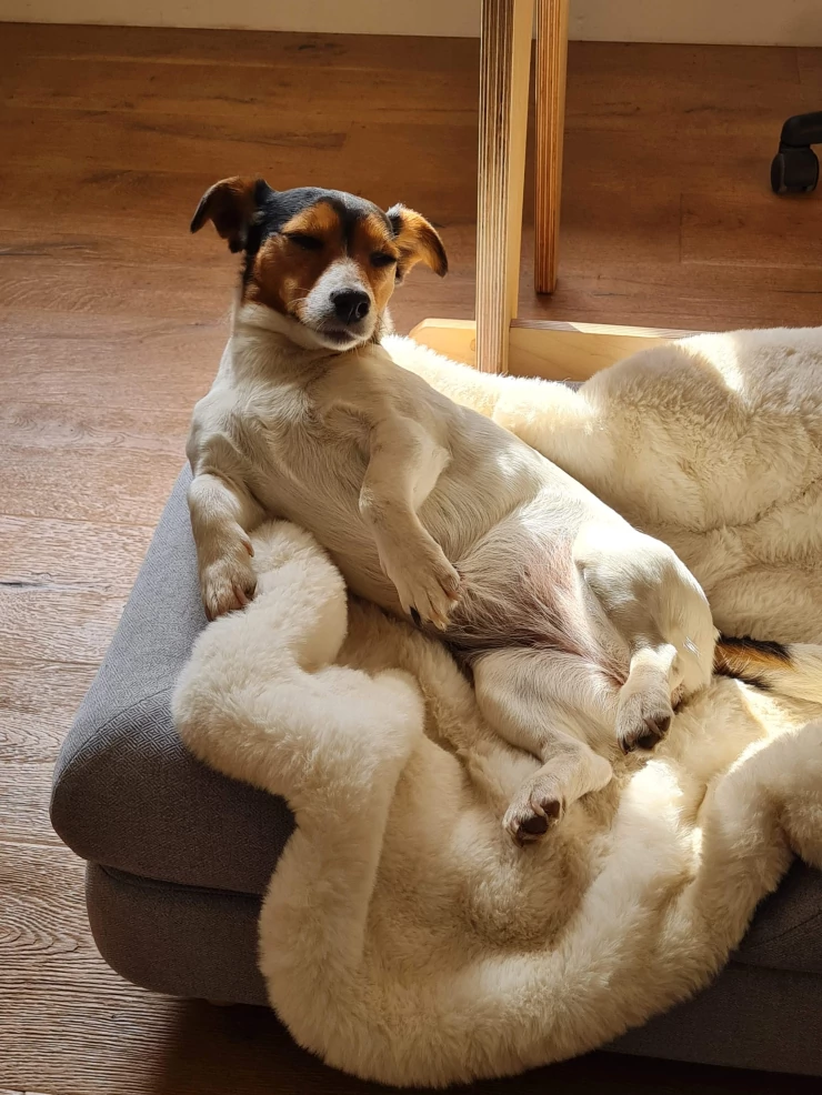 Titel: Vår hund gillar verkligen fårskinnsfilten, den är väldigt mjuk och fungerar bra på sängen Topology! den är också snygg som egen filt.